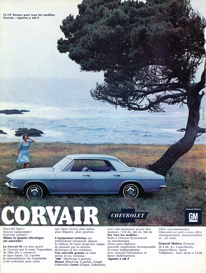 From this weeks batch of French car advertisements taken form Connaissance des Arts magazine that I have posted comes this second generation Chevrolet Corvair ad which dates from 1965. Second generation Corvairs featured minor exterior restyling and independent rear suspension in place of the patented swing axle design of the earlier cars.