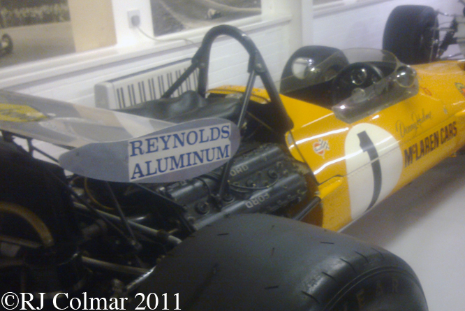After the disappointments of the Ford Indy derived V8 and Serenissima V8 used in the 1966 McLaren M2B, the interim BRM V8 Formula 2 based McLaren M4B and BRM V12 powered M5A of 1967 Bruce Mclaren bought 5 Ford Cosworth DFV motors for the 1968 season which were used as in the integral structure of the McLaren M7A designed by Robin Herd, Gordon Coppuck and Bruce himself.