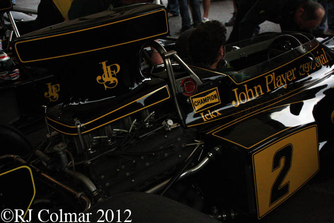 I believe the two cars seen here both belong to Classic Team Lotus with the #2 most likely being a replacement chassis for the wrecked Lotus 72/R5 driven by Emerson Fittipaldi in C spec to victory in the 1970 US Grand Prix and last used in E spec by Brian Henton in the 1975 US Grand Prix.