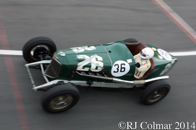 Dougal Cawley headed the opening lap of the Fox & Nichol Trophy in his GN Ford known as Piglet, but after 12 mins it was a surprised Rudiger Friedrichs who took the flag on his debut on the 1932 #138 Alvis Firefly seen above in third place.