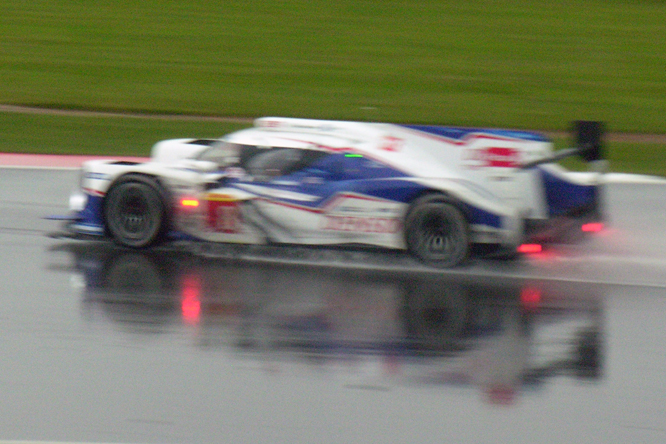 Toyota led the opening laps of the race but it was not long before André Lotterer in the #2 Audi, seen above about to relieve the Sebastian Buemi of third place, got to the front of the field. As the first hour of the race unfolded rain started to fall that would, unknown to anyone at the time decide the outcome of the race. Buemi pitted from fourth to take on a set of intermediates, Wurz pitted from second to take on full wets as Toyota wisely split it’s strategy between its cars while the ever optimistic Audi Team elected to stay on slicks.
