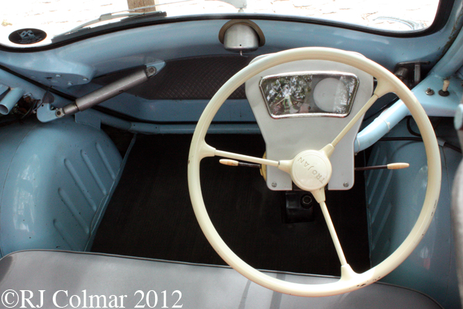 The car is powered by an air cooled single cylinder 4 stroke motor attached to a four speed gearbox which, unusually for a bubble car, included a reverse gear.