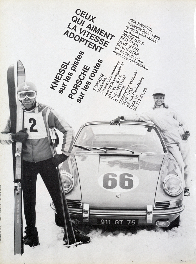 This weeks advertisements taken from the French Magazine Connaissance des arts feature a Porsche 911 and Kneissl Skis in a rare example of cross brand marketing by their French distributor Sonauto of Paris.