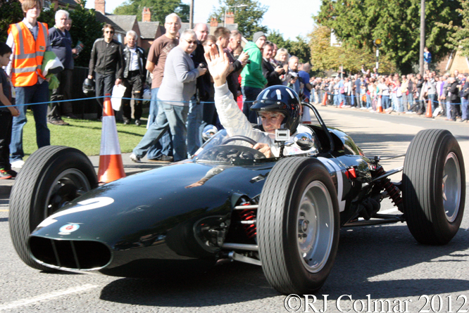 In 1973 BRM old boy Jackie Stewart won his third and final World Championship driving for the Tyrrell team, it was a real treat to see Sir Jackie driving a 1973 006 model through the streets of Bourne, not quite the Monaco Grand Prix, but without the crash barriers and safety fences of the Principalities street circuit, no less exciting.