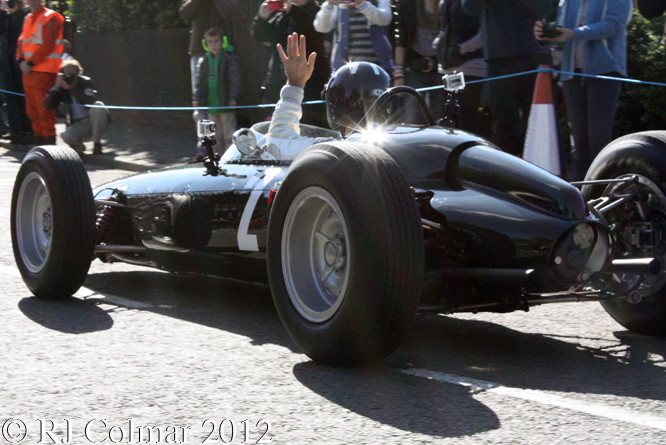 Rick Hall was instrumental in the organisation of last Sunday’s BRM Day his son Rob is seen above driving the P48 Mk I which belongs to Bruce McCaw of Seattle. This car was originally driven by Graham Hill and Dan Gurney in 1960/61, it started life as a front engined Type 25 chassis 27/2 ALSO known as 257 and was converted to P48/2, the second rear engined BRM, for the 1960 season When Graham Hill and Dan Gurney drive it.