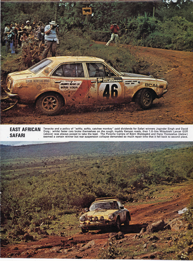 Bjorn Waldegård and Hans Thorszelius were on target to win the 1974 East African Safari Rally in their yellow Porsche Carrera bottom, until repairs to their rear suspension dropped them to second behind the Mitsubishi Lancer of Joginder Singh and David Doig seen in the top photo of this single page tearout of the event taken from MotorSport June 1974.