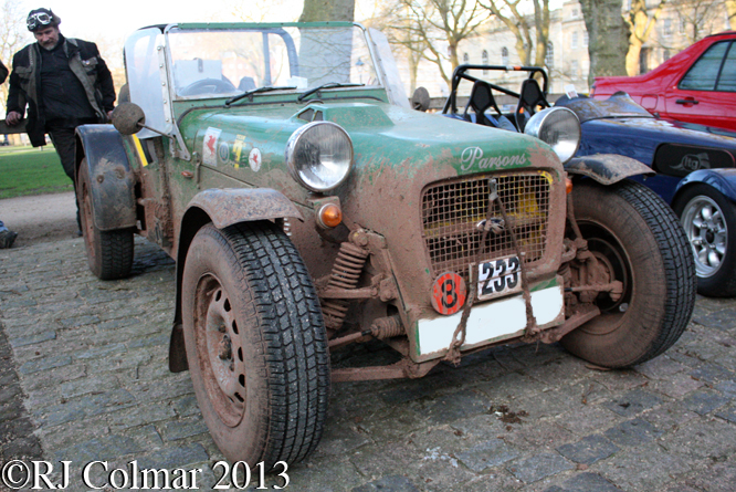 Among assorted Skoda’s, VW Beetles and an Mazda MX5 with an urban paint job starting from Cirencester was this rare #222 Gregory trials car driven by Josh Moss and Chris Ferin. At the Haynes motor museum there was a compulsory two hour break during which I enjoyed a hearty Full English Heart Attack breakfast and a 1/2 hour flat on my back to ease the inevitable stiffness that occurs after sitting in a confined space for 2 hours in ambient temperatures a couple of degrees above freezing.