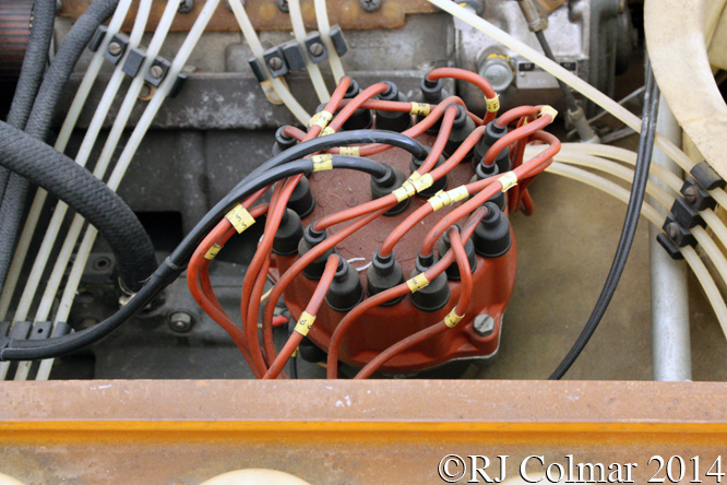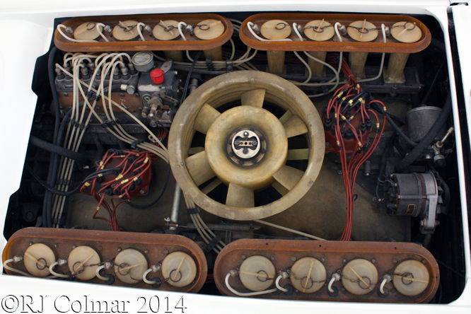 The 400 hp Ford Cosworth DFV was to become the mainstay of Formula One right through the 1970’s, it was far in advance of the Lotus 49 chassis and would only be toppled by the hugely more expensive turbocharged motors in the early 1980’s after 155 Grand Prix Victories. One of the triangular aluminium top engine mountings can be seen bolted with three bolts on the leading edge of the cam cover tapering into the back of the monocoque to which it was attached by a single bolt. Three further such mountings were all that were required to integrate the motor into the structure of the car.