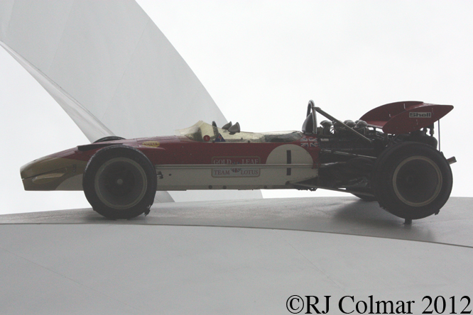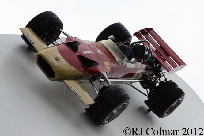 For 1970 Lotus had planned to have the 4 Wheel Drive Lotus 63 ready to challenge for championship honours however even Mario Andretti could not capitalise on any of the cars supposed advantages during 1969 and so the Lotus 49 was updated for a fourth season of competition with 13 inch front wheels to make use of the latest Firestone Tyres as a stop gap while the design and build of the Lotus 72 was finalised.